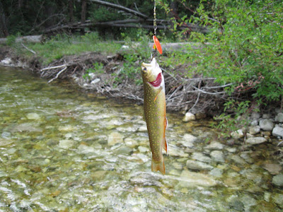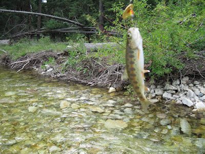 Fishing this portion of the river was great. There wasn’t one hole, riffle or calmer section of the river that I didn’t catch a fish. I used only two different spinners on this trip and they were my trusty "orange" Panther-Martin and a green Rooster Tail. Trusty won out over the recommended Rooster Tail. In all I caught at least 27 small trout on this day. As a matter of fact, the trout were more plentiful than the mosquitoes/flies for once (just barely). I caught brookies, rainbows, golden/redband trout and what I swear was a small brown trout. But I’ve been told there are no brown trout in the Middle Fork but I may have to disagree with this common thinking.